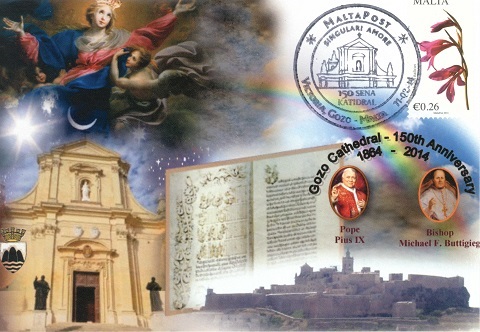 For the occasion of the 150th Anniversary of the foundation of the Gozo Cathedral, MaltaPost issued a special postmark that was used on Monday 11th August 2014 at the Victoria, Gozo Post Office.